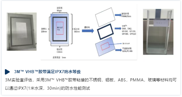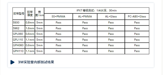 耐水性和密封性至关重要,因为密封不完全可能会影响显示屏的寿命和防潮性能。确保良好的防水性能可以延长显示屏的使用寿命,特别是在潮湿环境中。3M™ VHB™胶带的防水性能可达到IPX7等级,极端应用下的显示屏在短时间内浸入水中仍能正常工作。3M™ VHB™胶带适用于需要较高防水密封性能的显示屏组装的应用场景。
