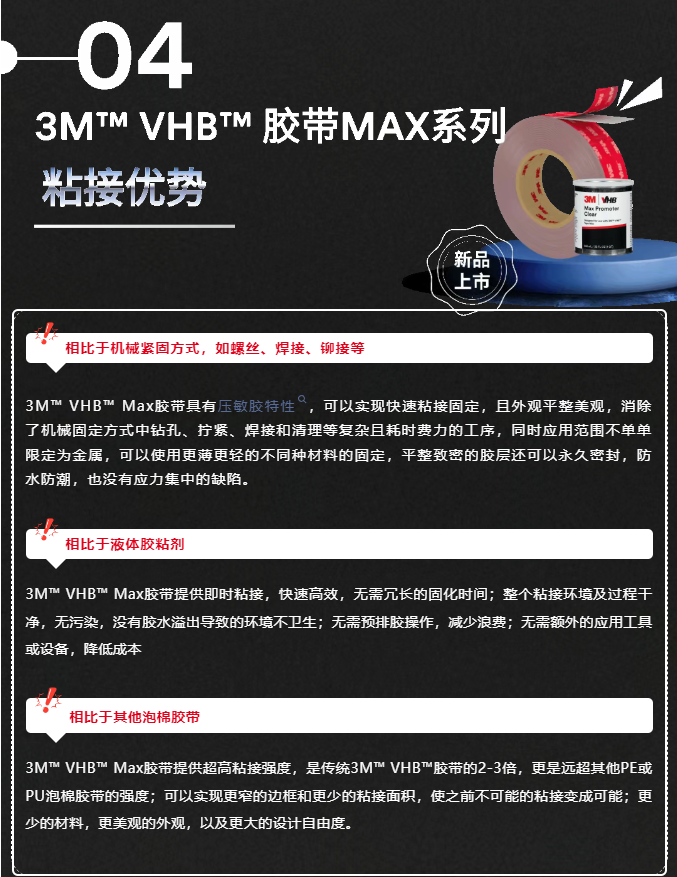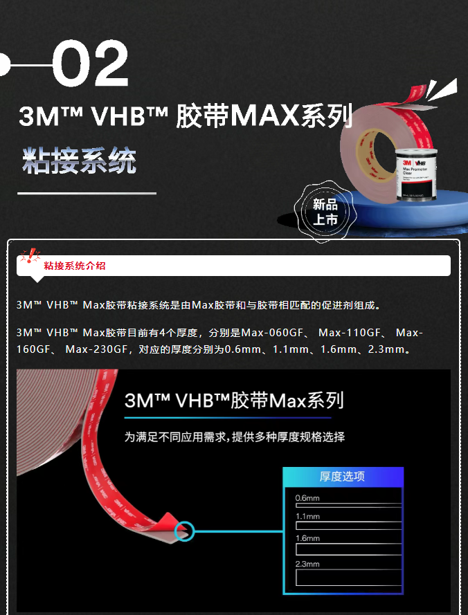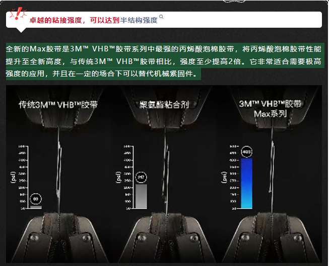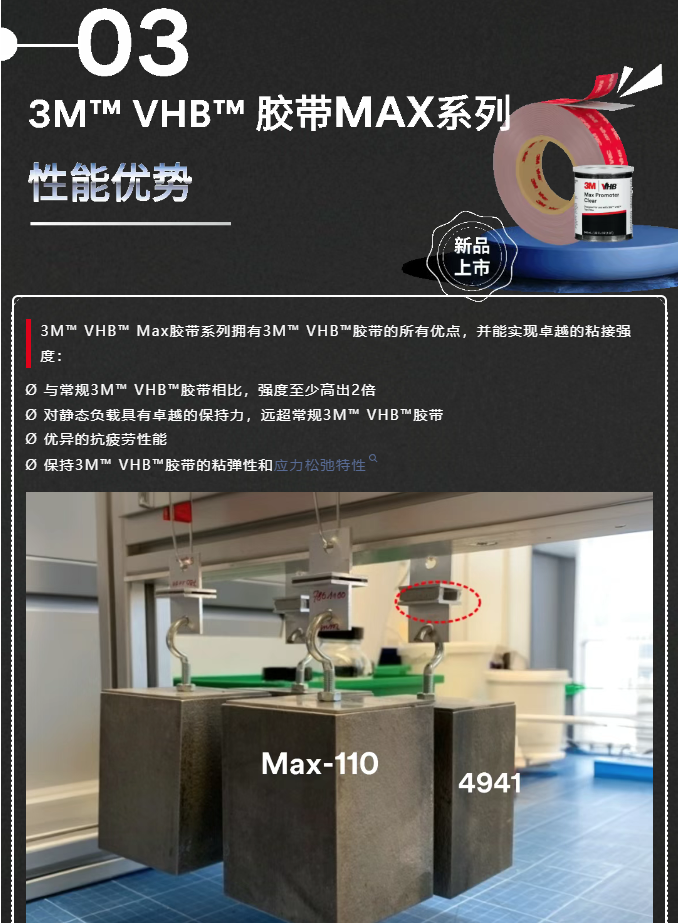 3M™VHB™ Max胶带不仅延续了3M在粘接领域的创新基因:从强度到设计自由度,从施工便捷性到产品性能,都以好表现,重新定义了“工业粘接”。