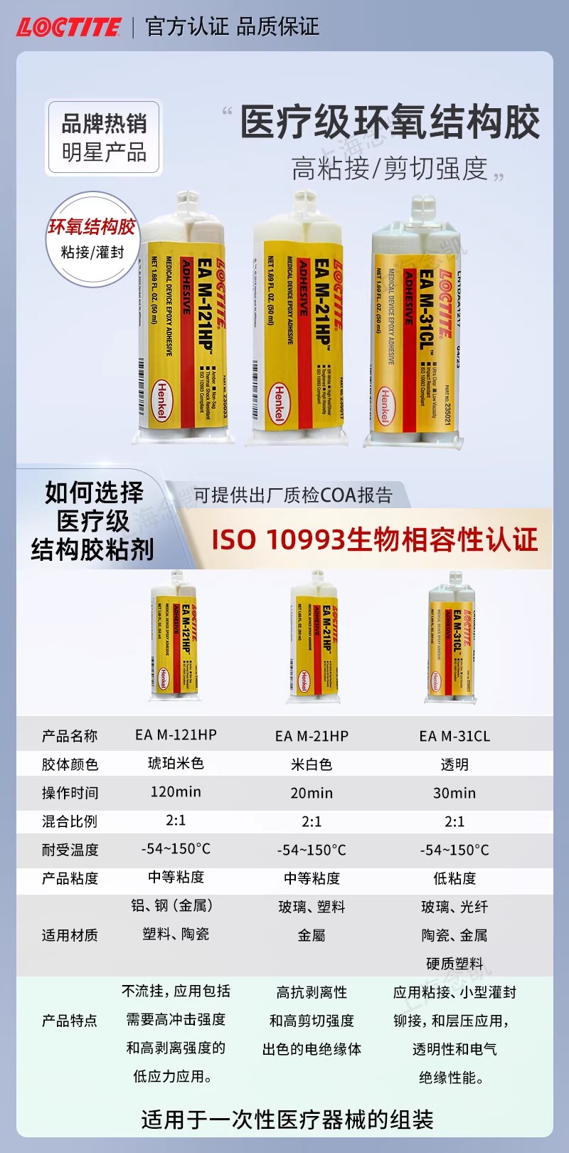LOCTITE.EA M-121HP™ 是一种不流挂的环氧胶粘剂,混合后可在室温下固化,形成坚韧的琥珀米色胶层,具有出色的抗剥离和抗冲击力。完全固化后,环氧树脂具有优异的抗热震性、优异的机械和电气性能,并能耐受多种溶剂和化学品的侵蚀,典型的应用包括需要高冲击强度和高剥离强度的低应力应用。粘合不同的材料,包括铝、钢和其他金属,以及各种塑料和陶瓷。适用于一次性医疗器械的组装使用。