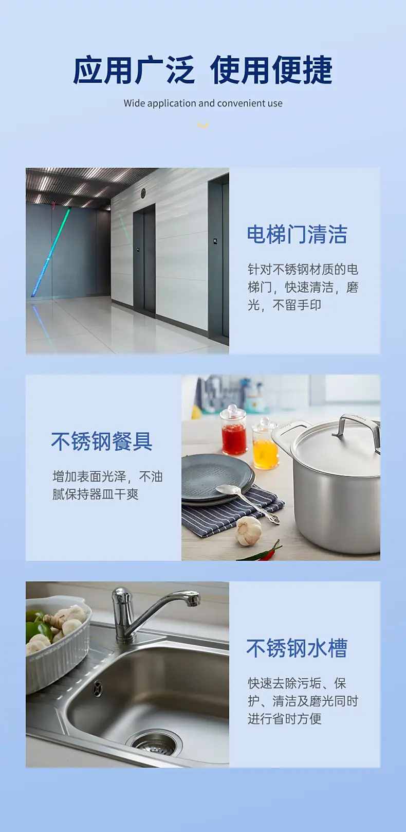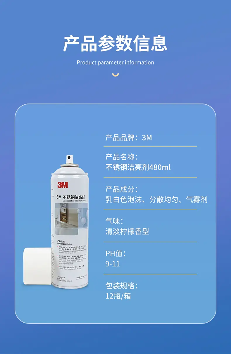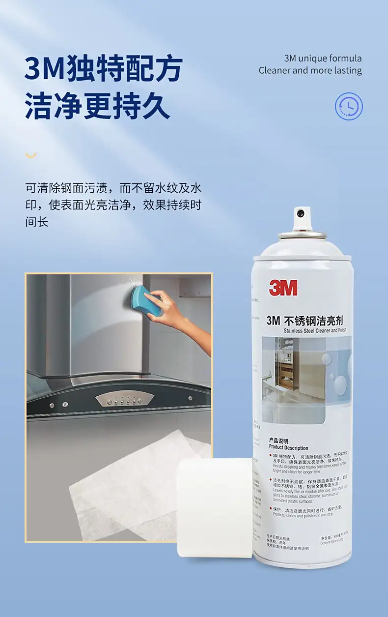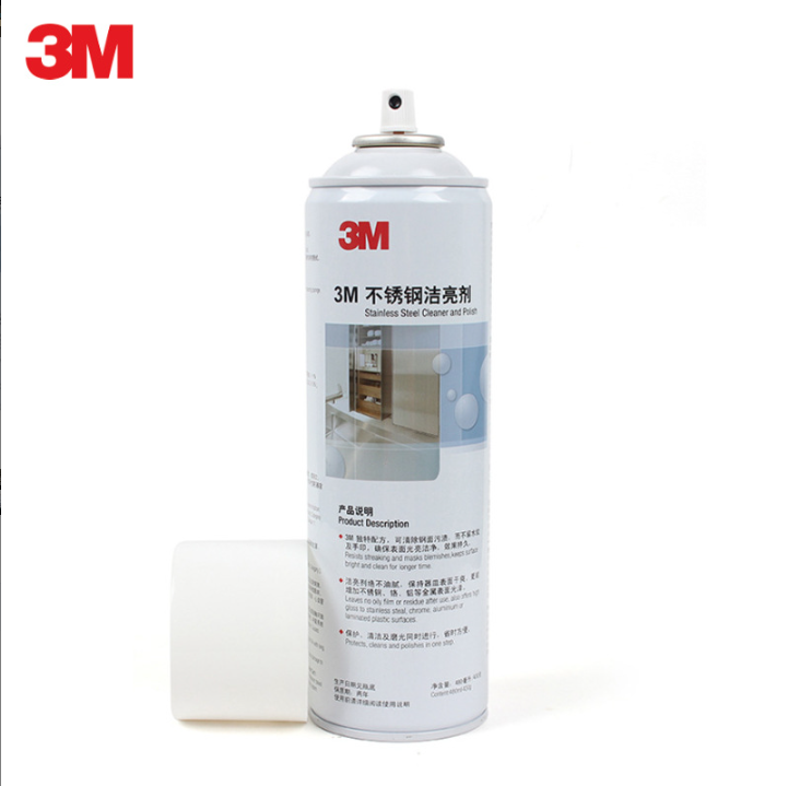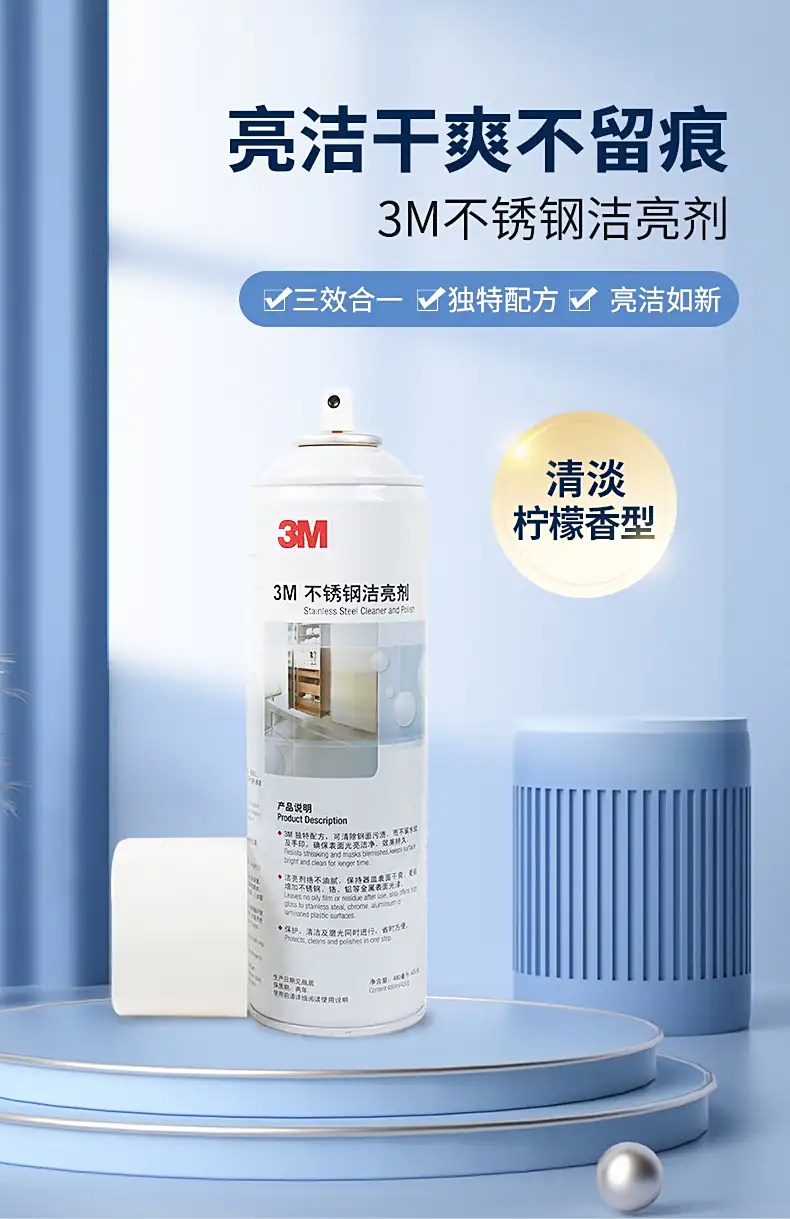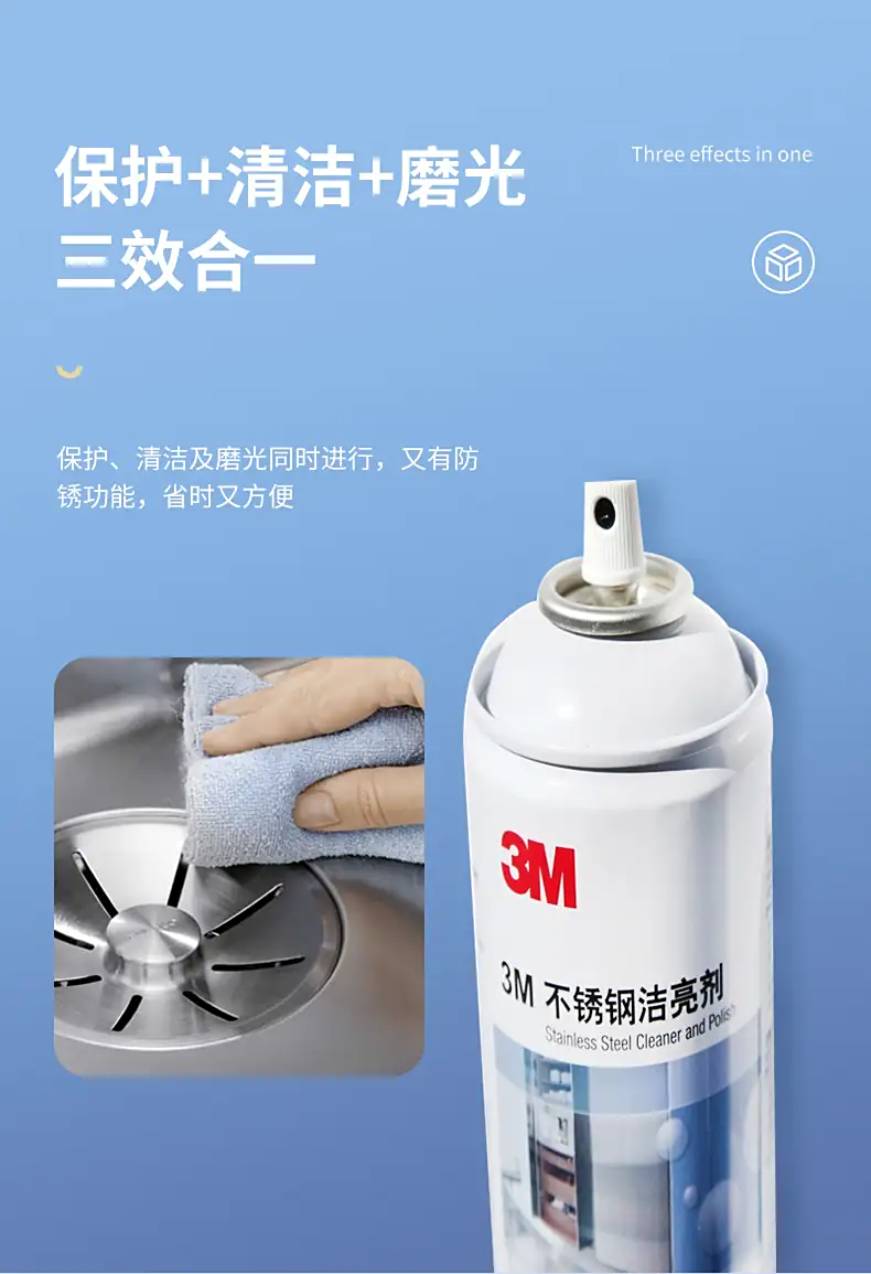 3M不锈钢洁亮剂三效合-独特配方 亮洁如新亮洁干爽不留痕,可除去钢面污渍,而不留水纹及水印,使表面光亮洁净,效果持续时间长。