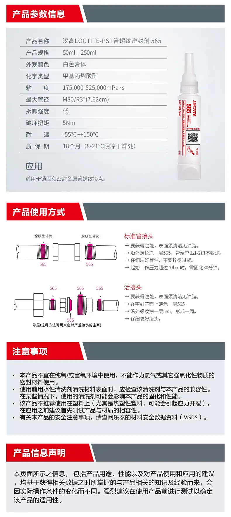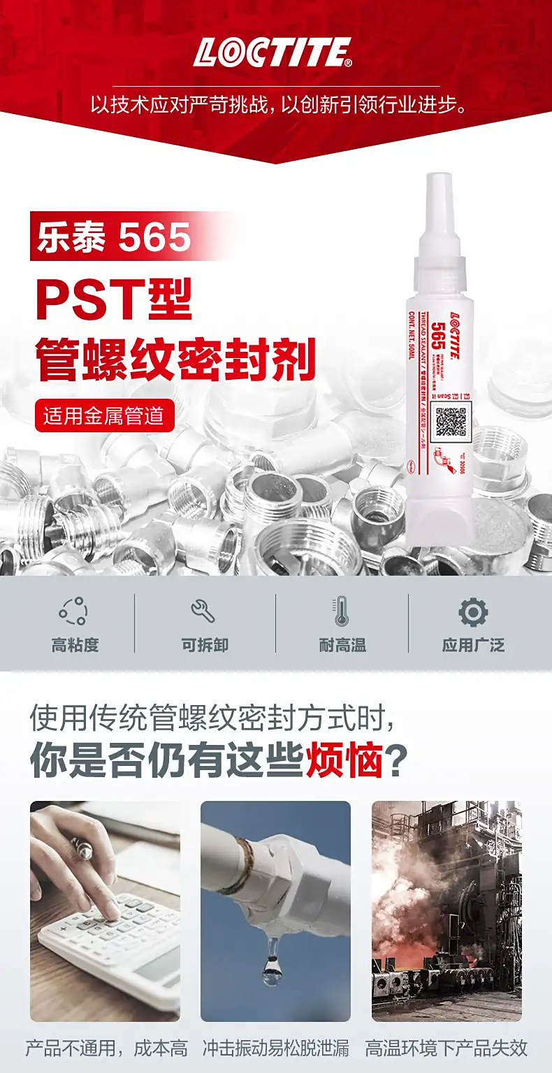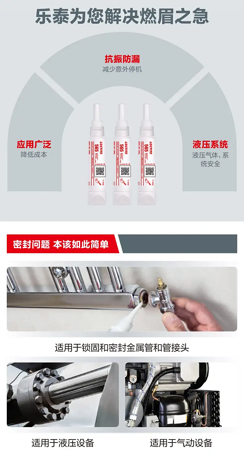 乐泰565单组份,高粘度,低压力的丙烯酸密封胶通.用型 粗牙螺纹,管子密封音,固化前可调整,耐溶剂性能好,适用于锥管螺纹的密封。适合于锁固和密封螺纹紧固件,该产品在隔绝氧气的金属密封面间固化,可以防止由于震动或冲击而引起的松动或泄漏。