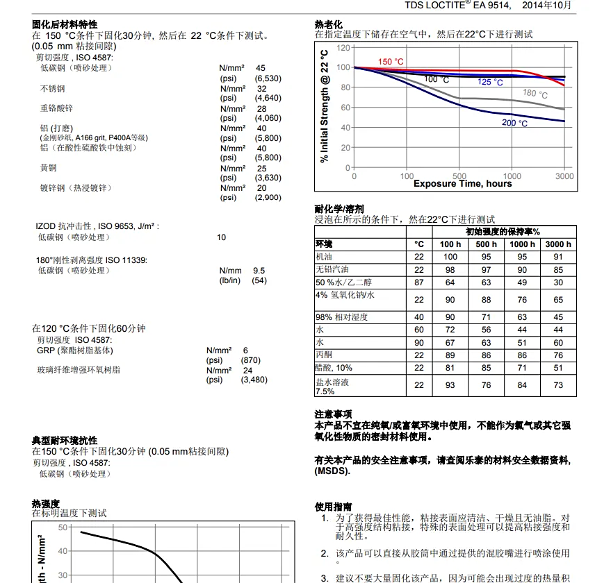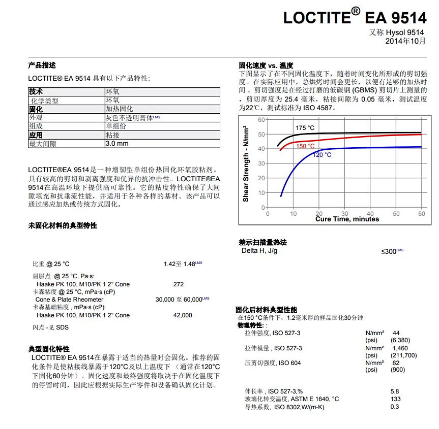 LOCTITE®EA 9514是一种增韧型单组份热固化环胶粘剂,具有较高的剪切和剥离强度和优异的抗冲击性。LOCTITE@EA9514在高温环境下提供高可靠性。它的粘度特性确保了大间隙填充和抗垂流性能,并适用于各种各样的基材。该产品可以通过感应加热或传统方式固化。
