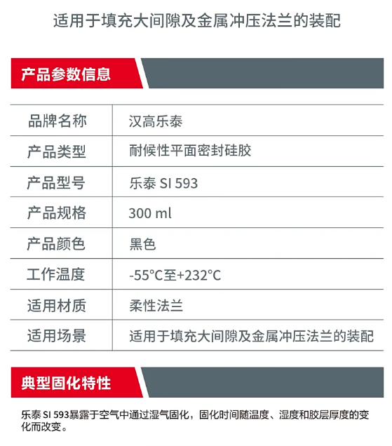 乐泰SI 593对大多数表面具有较好的粘接和密封作用(不包括混凝土)。该产品抗老化,耐候性好且耐热循环,不会变硬、收缩和破裂.。该产品能耐得住极高的热循环、紫外光照射和臭氧。