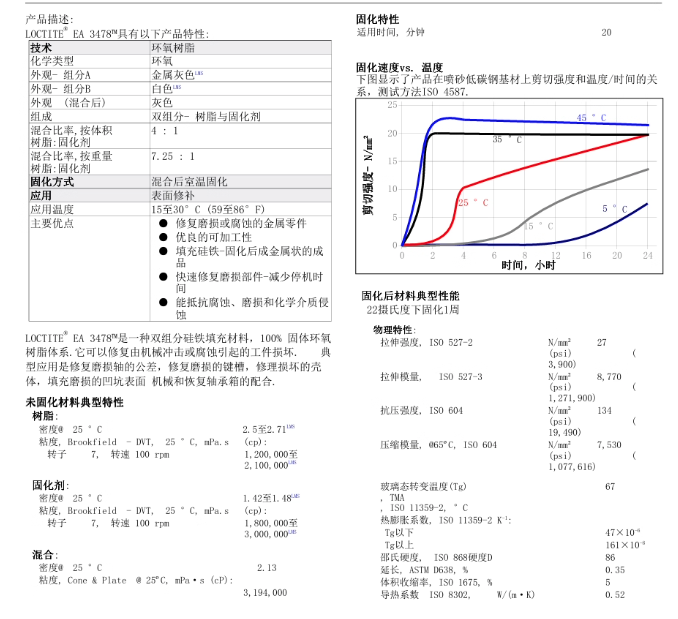 LOCTITE”EA 3478“是一种双组分硅铁填充材料,100%体环树脂体系.它可以修复由机械冲击或腐蚀引起的工件损坏.典型应用是修复磨损轴的公差,修复磨损的键槽,修理损坏的亮体,填充磨损的凹坑表面机械和轴承箱的配合.