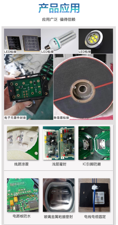 广泛应用于不锈钢制品、食品机械、汽车工业、冷藏车等的粘接密封,如冰箱、微波炉、线路板、汽车喇叭、电子元件及机械部位的粘接密封。
