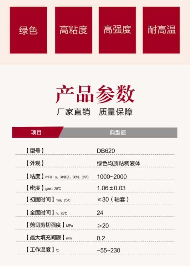 DB620圆柱型固持胶是一种改性的甲基丙烯酸酯厌胶,特点是绿色、高粘度、耐高温,固化速度慢。