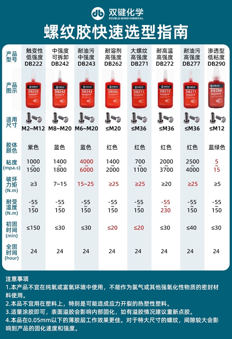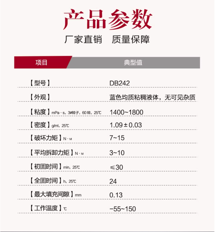 双键螺纹厌氧胶DB242 DB243用于M6~M20的螺纹紧固件的锁固、密封,可用普通工具拆卸;通用型、触变性粘度、溶油性好,可在轻微油质表面使用。