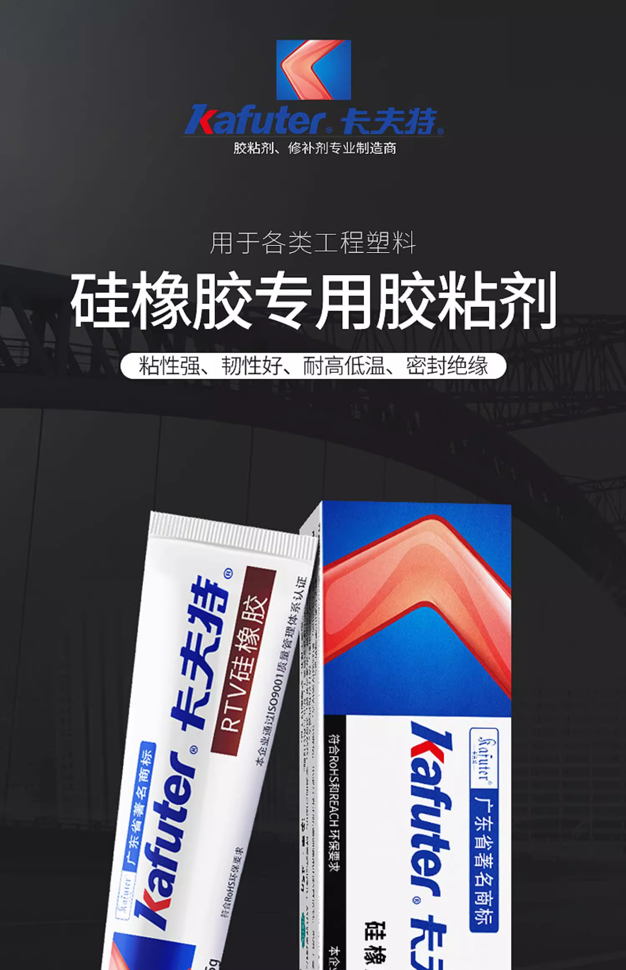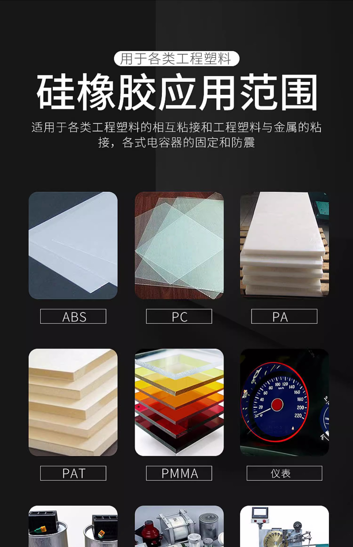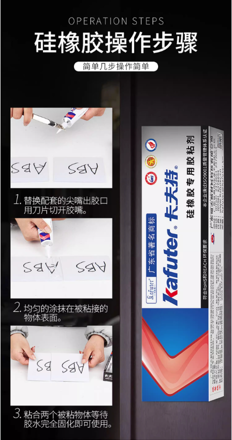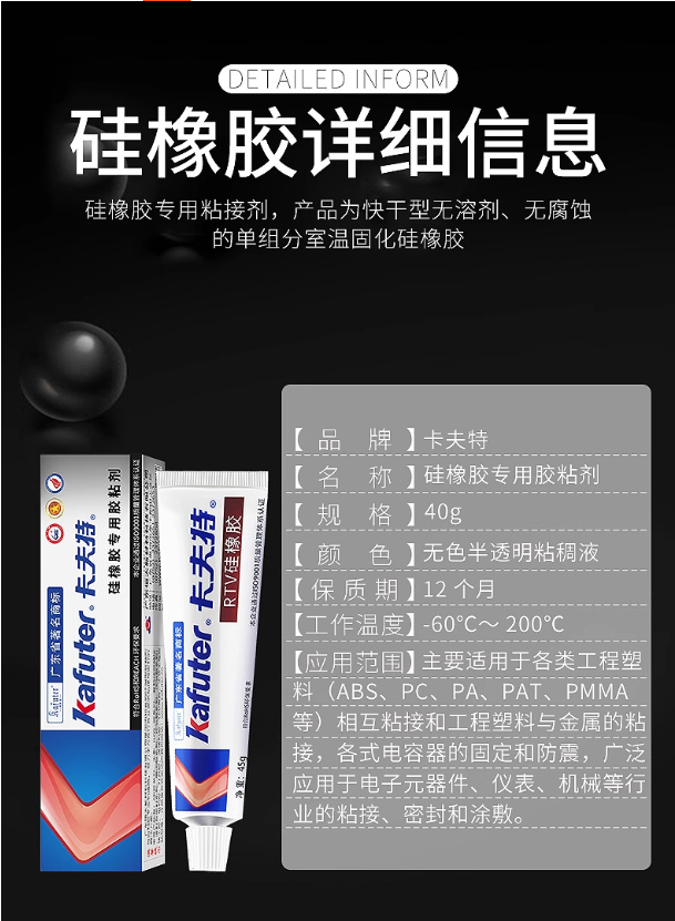 该产品主要用于硅橡胶制品的粘接和密封,胶板、硅橡胶O型圈等制品的对接、拼接,或与金属、玻璃、石材等材料的粘接,粘接强度高。此外,它也适用于多种工程塑料(如ABS、PC、PA、PVC、PMMA等)的自粘或互粘,以及这些塑料与金属、玻璃、石材等的粘接。2