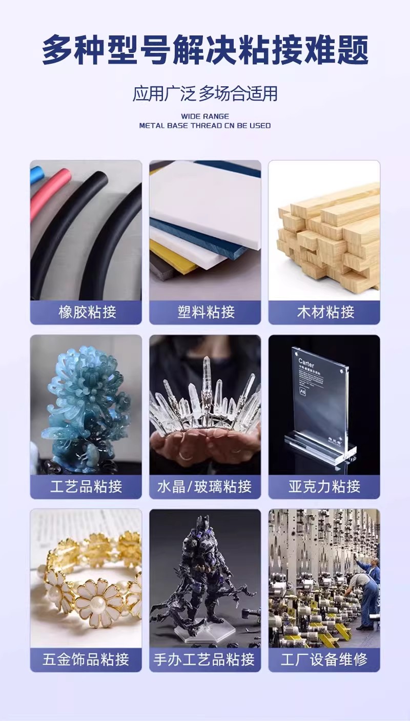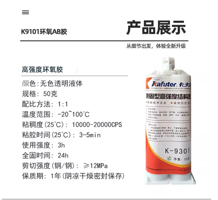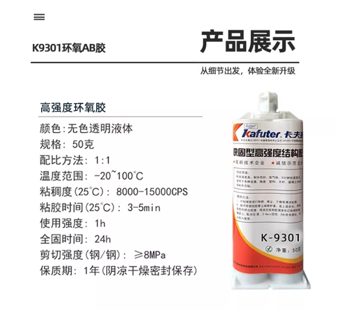 卡夫特K-9101是一种透明环氧树脂胶、快干等特点,常温下30分钟可初步固化,24小时完全固化后达到粘接效果。其工作温度范围为-20°C至100°C,粘接强度高,耐水、耐油、耐弱碱、耐酸及耐溶剂和化学品。该产品用于金属(铜除外)、橡胶、陶瓷、玻璃、石材、木材、电子元器件等多种材料的粘接与修补,常见于电子电器组装、工业零件粘接、工艺品制作及家庭维修等场景。1卡夫特K-9301是一种常温固化型快固环氧树脂胶,固化速度更快,常温下3~5分钟即可凝胶,3小时达到初步强度(>10MPa),24小时完全固化后剪切强度>12MPa。它同样具有优异的耐化学性,适用于金属、非金属、硬质材料、电子元件、建筑材料、家居用品及工艺品(如水晶、陶瓷、玻璃、宝石)的粘接与修补。该产品在工业制造、汽车零件、电子元件组装、水晶陶瓷玻璃宝石粘合等领域应用广,尤其适合需要快固化的场景。