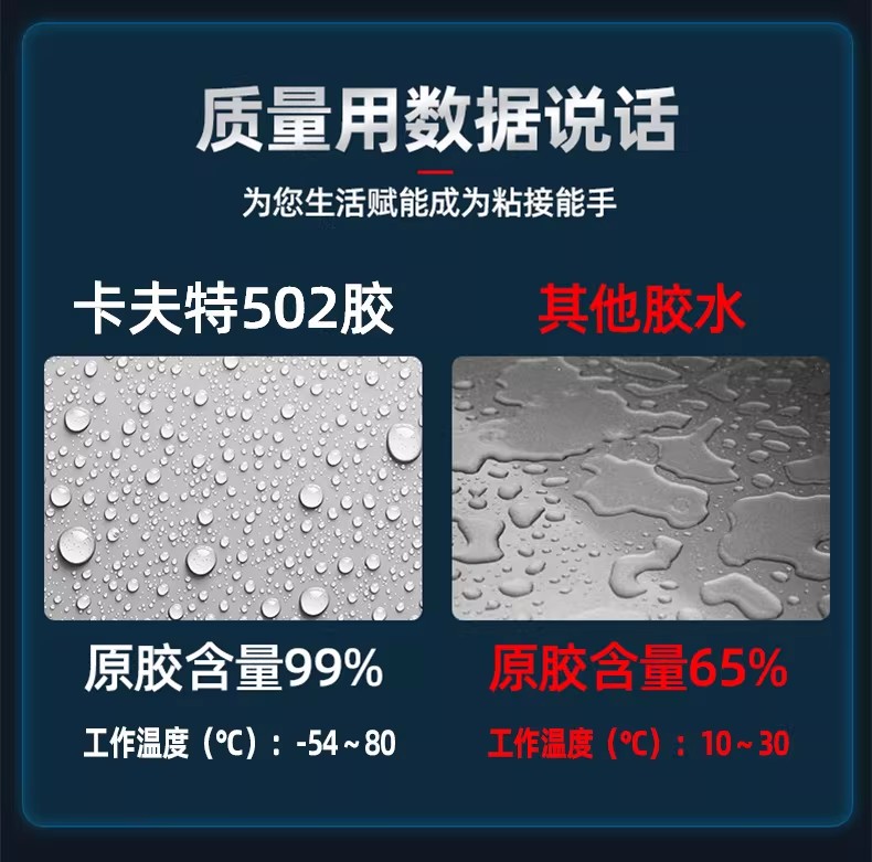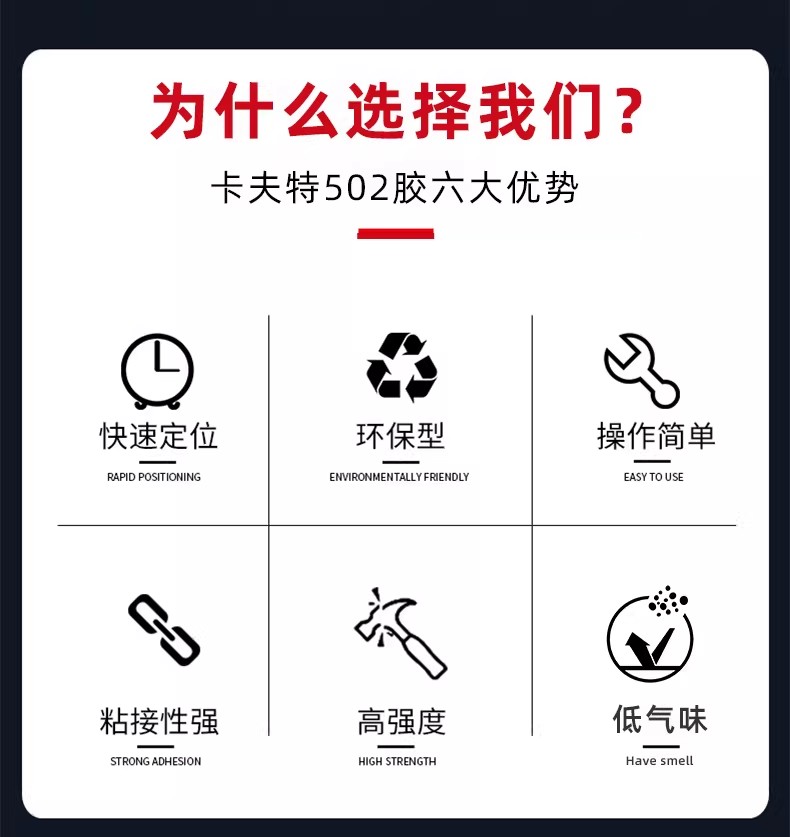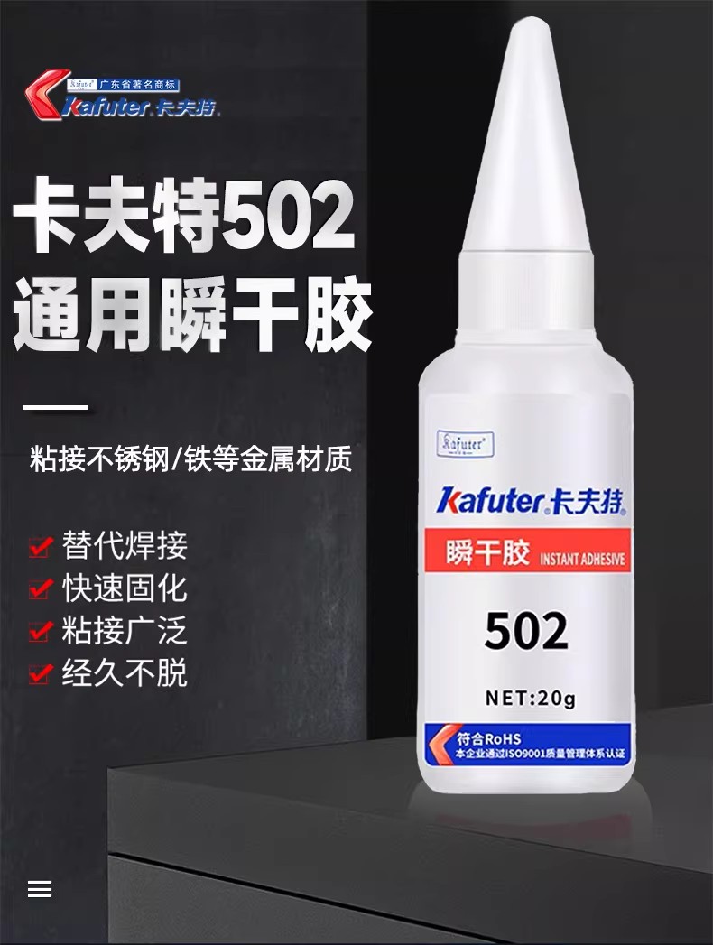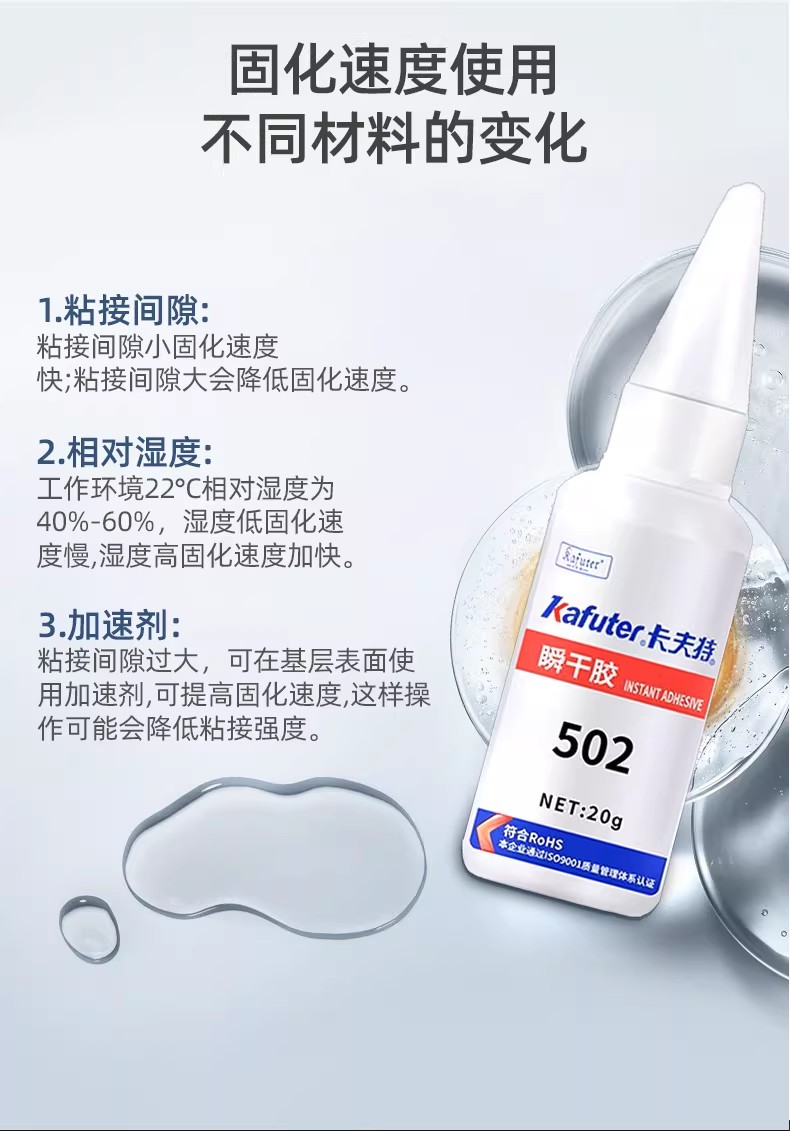 低白化、粘合:卡夫特K-502胶水解决了传统502胶水粘合后易产生白化的问题,粘合后几乎看不到白化现象,适用于五金、汽配、灯箱等多种场景。