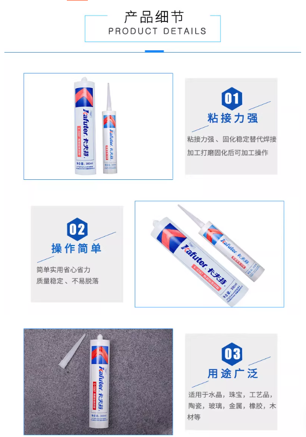机械及电子电器应用:可用于机械、电子电器、化工、家电等各种生产及维修领域的粘接与密封。