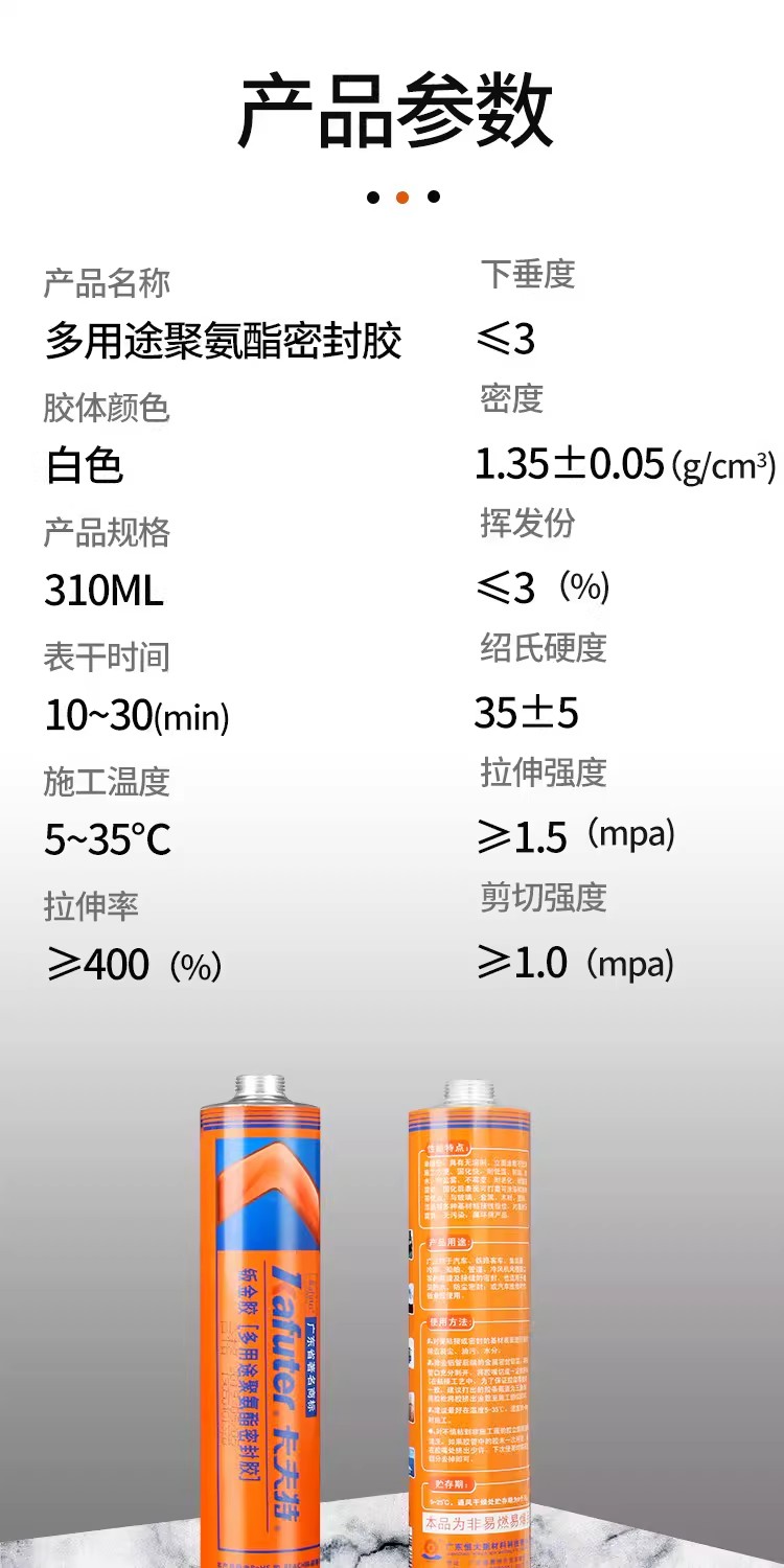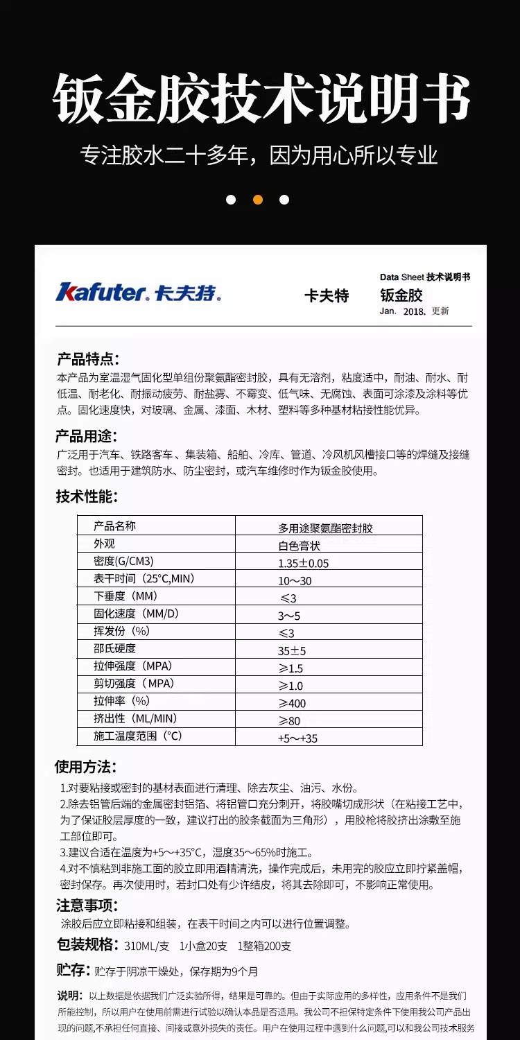 该产品为白色膏状,规格为310ml/支,适用于汽车维修、钣金修复、建筑防水等多种场景。